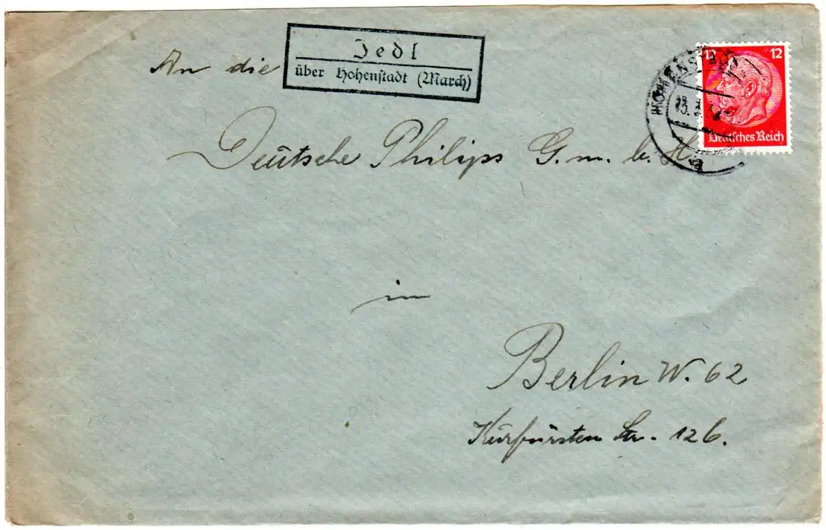 DR 1938, Landpost Stpl. JEDL über Hohenstadt (March) auf Brief m. 12 Pfg.