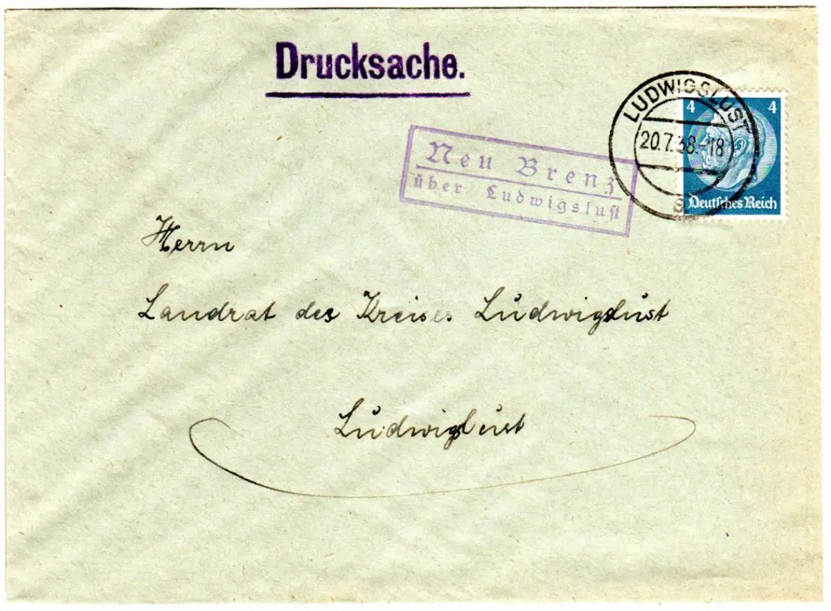 DR 1938, Landpost Stpl. NEU-BRENZ über Ludwigslust auf Brief m. 4 Pf.
