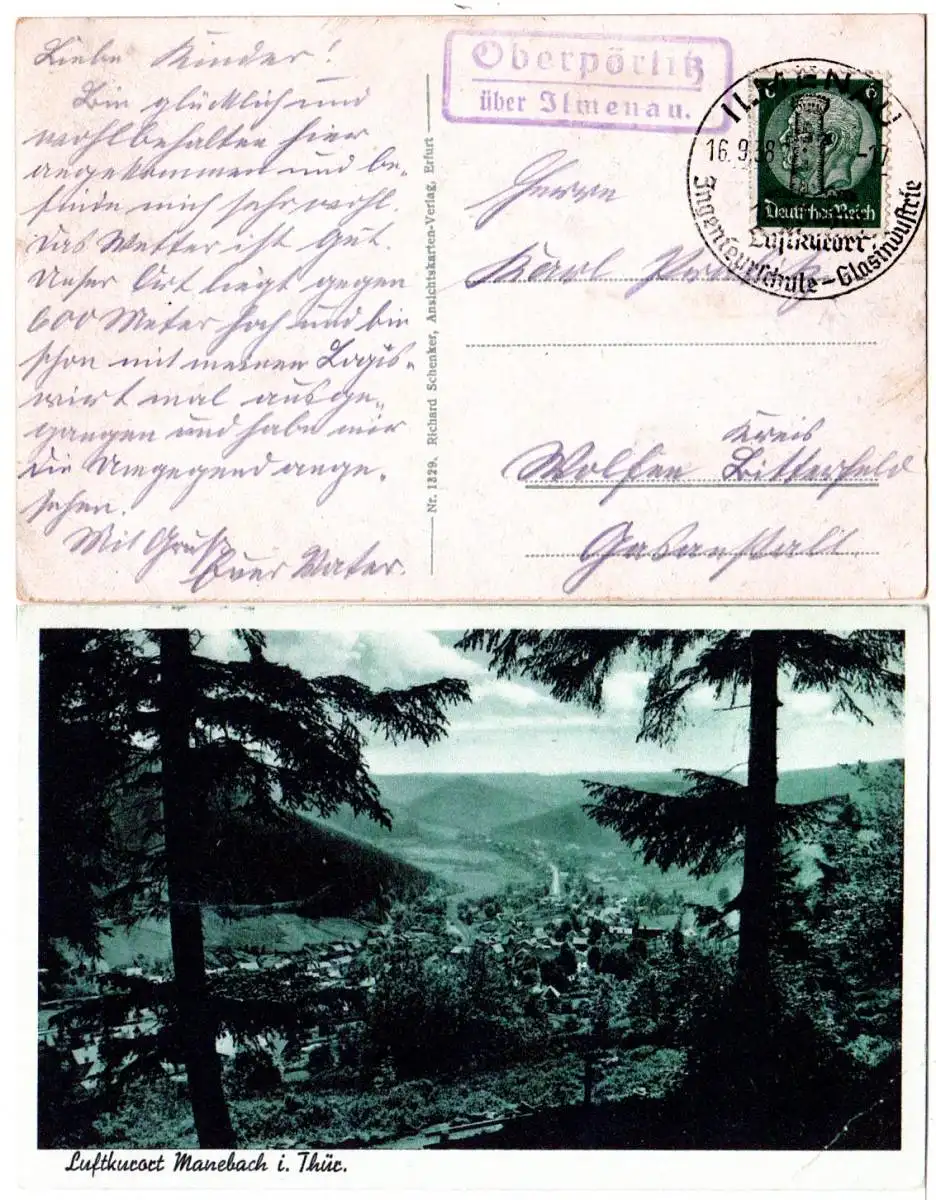 DR 1938, Landpost Stpl. OBERPÖRLITZ über Ilmenau auf Manebach sw-AK m. 6 Pf.