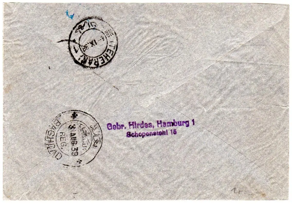 3x25 Pf. m. perfins Firmenlochung GH (Gebr. Hirdes, Hamburg) auf gut erhaltenem Luftpost-Reko Brief n. Persien.