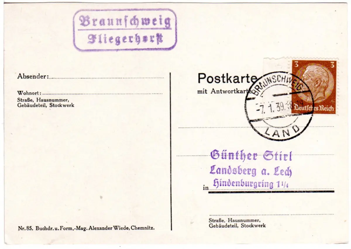 DR 1939, Flughafen-Stpl. Braunschweig-FLIEGERHORST auf Karte m. 3 Pf.