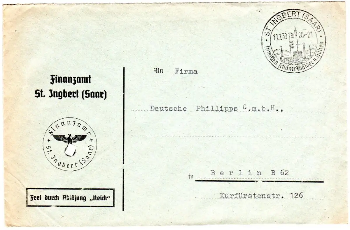 DR 1939, Frei durch Ablösung Reich Finanzamt Brief v. St. Ingbert (Saar)