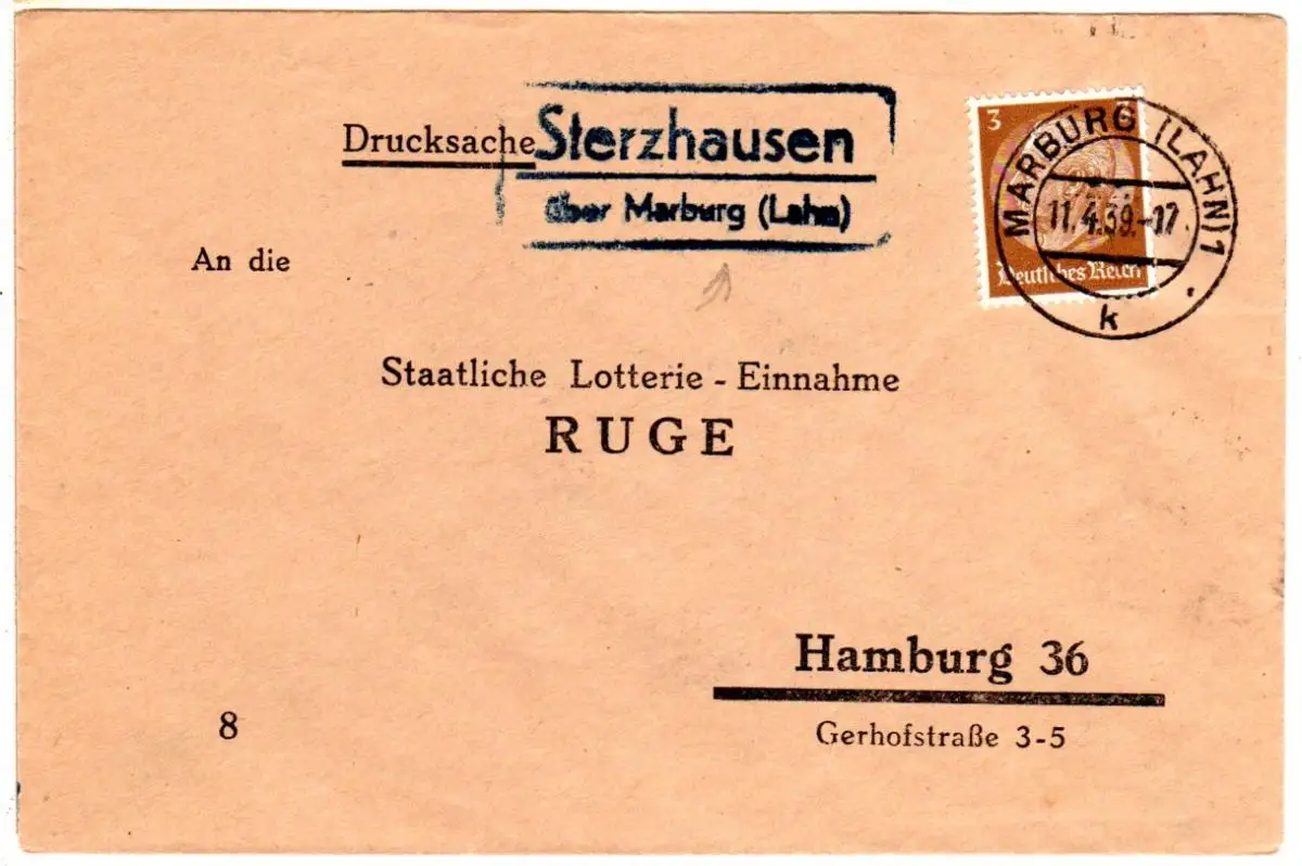 DR 1939, Landpost Stpl. STERZHAUSEN über Marburg auf Drucksache Brief m. 3 Pf.