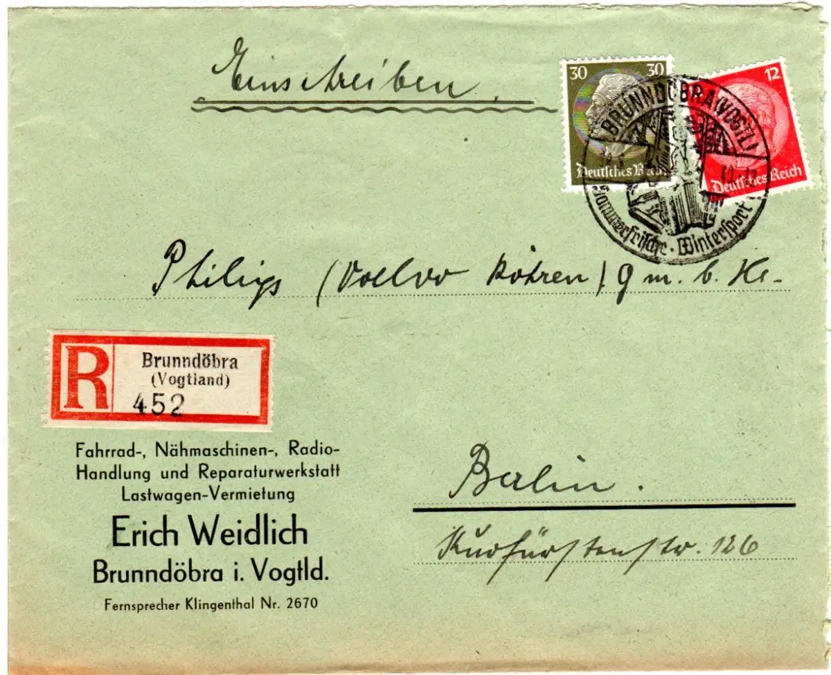 DR 1940, 12+30 Pf. auf Einschreiben Brief m. Sonderstpl. v. Brunndöbra Vogtland