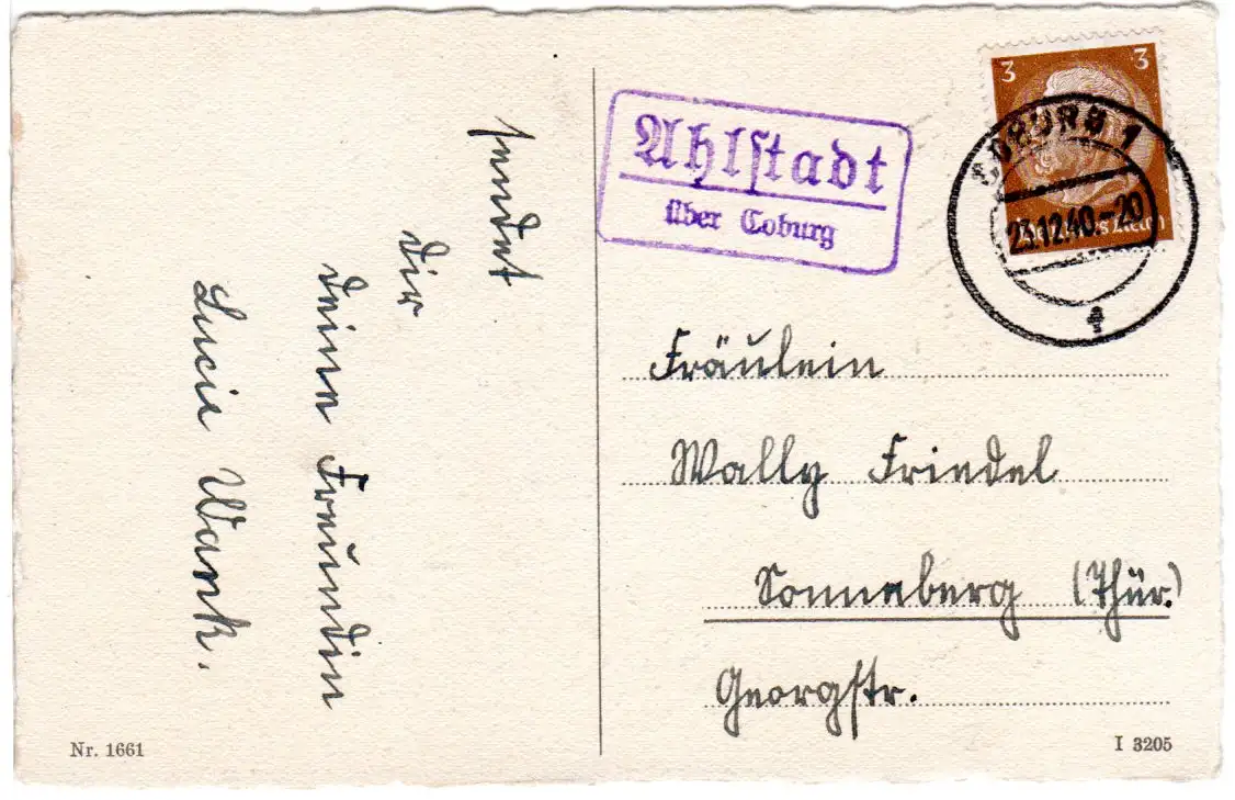 DR 1940, Landpost Stpl. AHLSTADT über Coburg auf Karte m. 3 Pf.