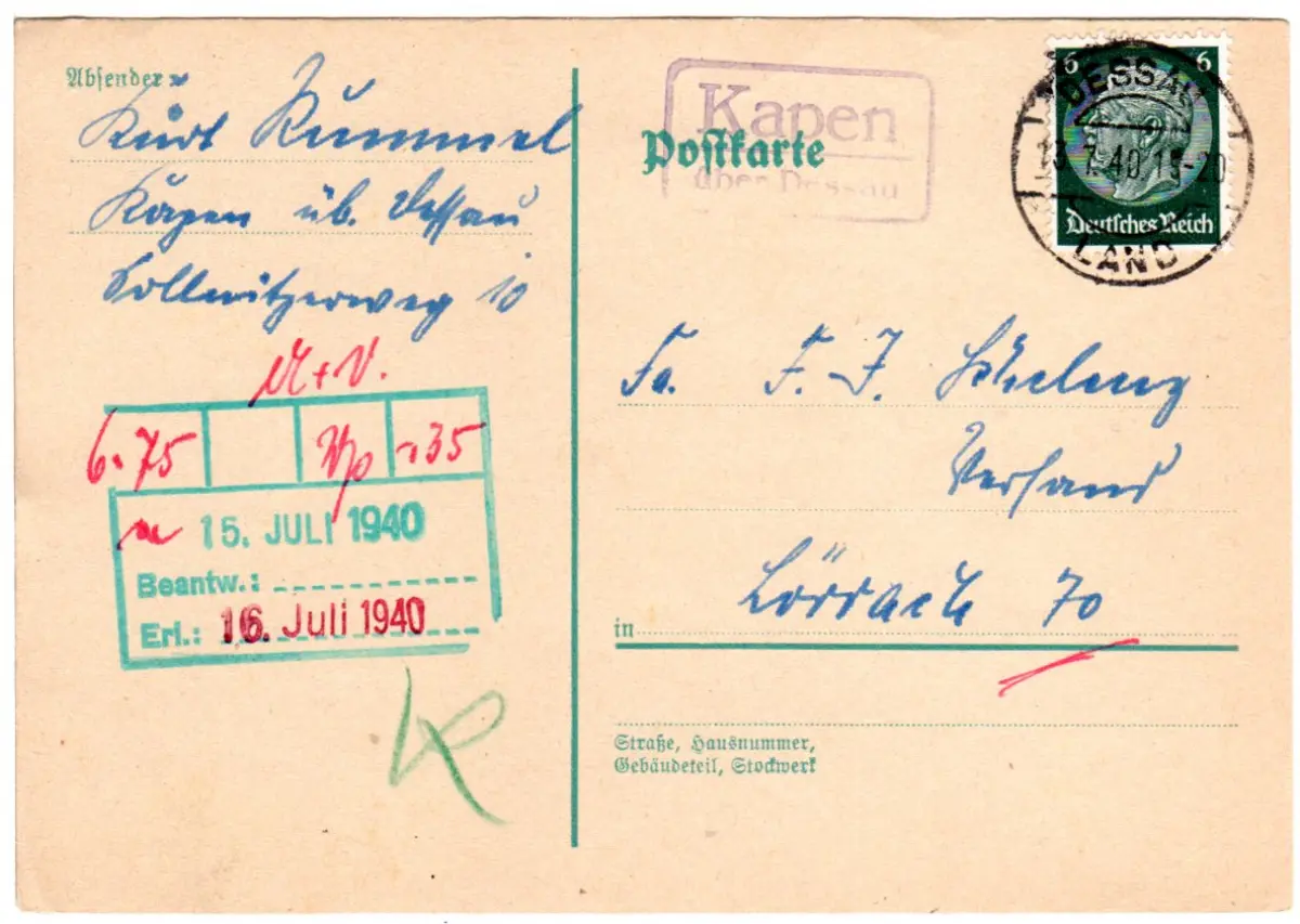 DR 1940, Landpost Stpl. KAPEN über Dessau auf Karte m. 6 Pf.