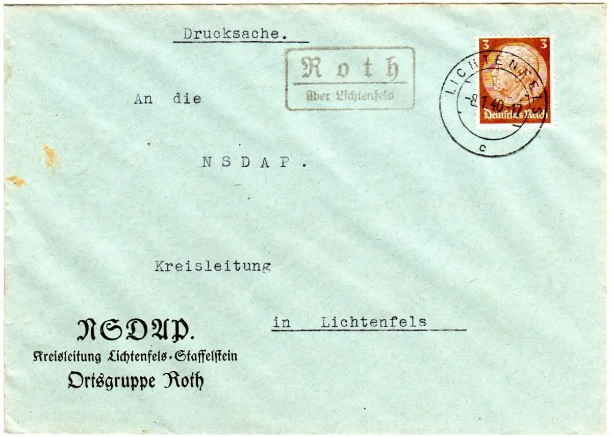 DR 1940, Landpoststpl. ROTH über Lichtenfels auf NSDAP Drucksache Brief m. 3 Pf.