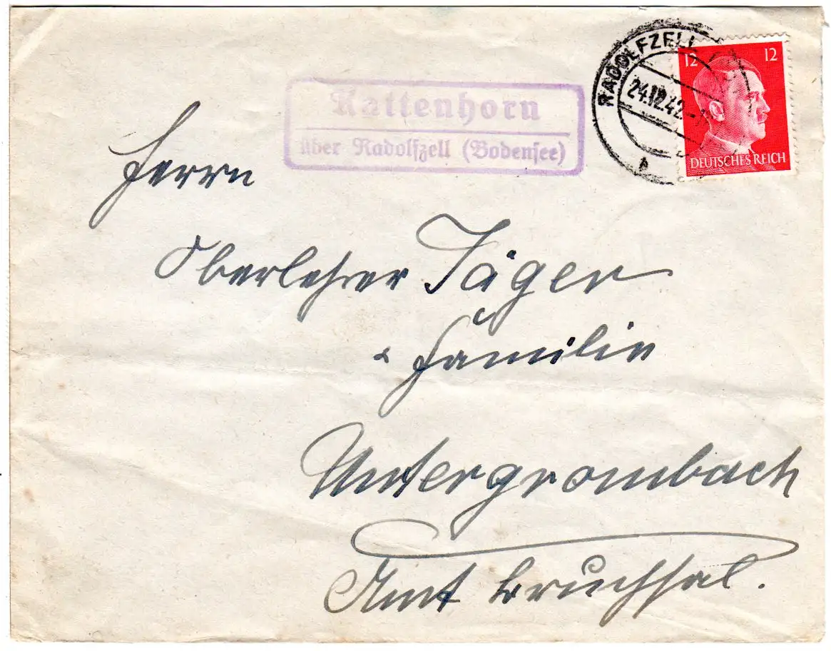 DR 1942, Landpost Stpl. KATTENHORN über Radolfzell auf Brief m. 12 Pf.