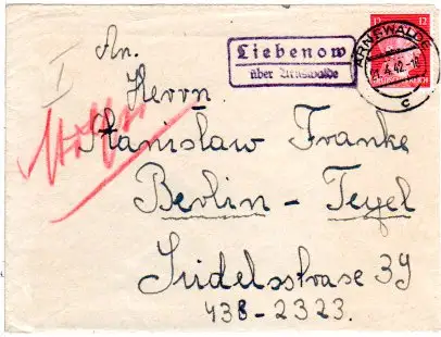 DR 1942, Landpost Stpl. LIEBENOW über Arnswalde auf Brief m. 12 Pf.