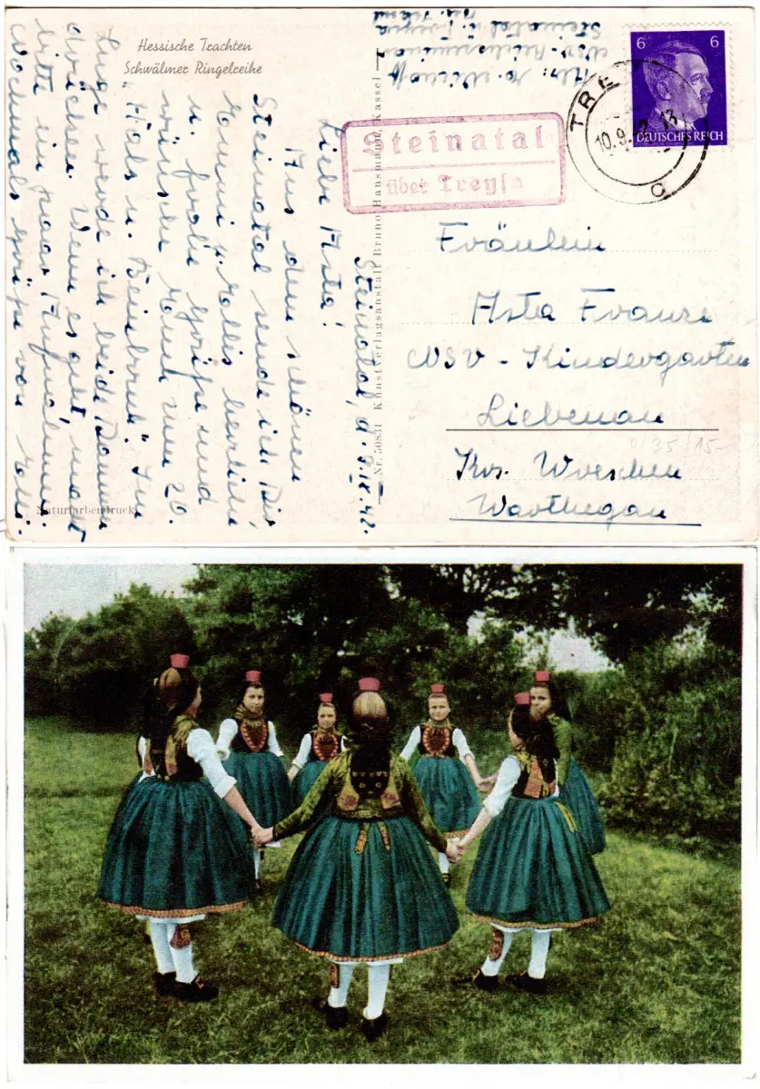 DR 1942, Landpost Stpl. STEINATAL über Treysa auf Trachten Farb-AK m. 6 Pf.