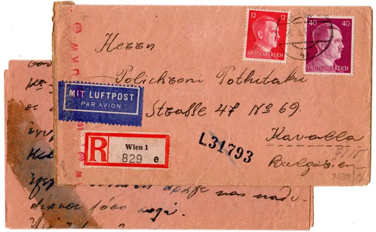 Ostmark Einschreiben Brief per Luftpost v. Wien via Sofia n. Kavalla (rückseitige Stempel. OKW- u. innen chemische Zensur auf mehrseitigem Briefinhalt. Erhaltung siehe scans.