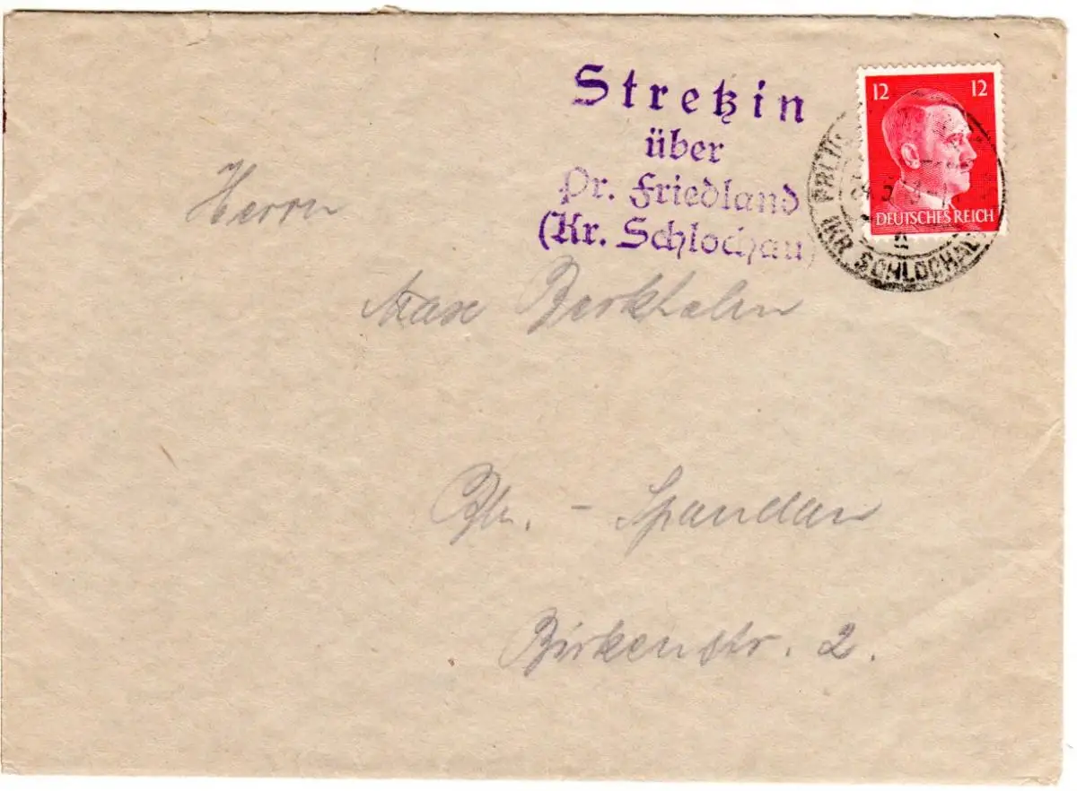 DR 1943, Landpost Stpl. STRETZIN über Pr. Friedland auf Brief m. 12 Pf.
