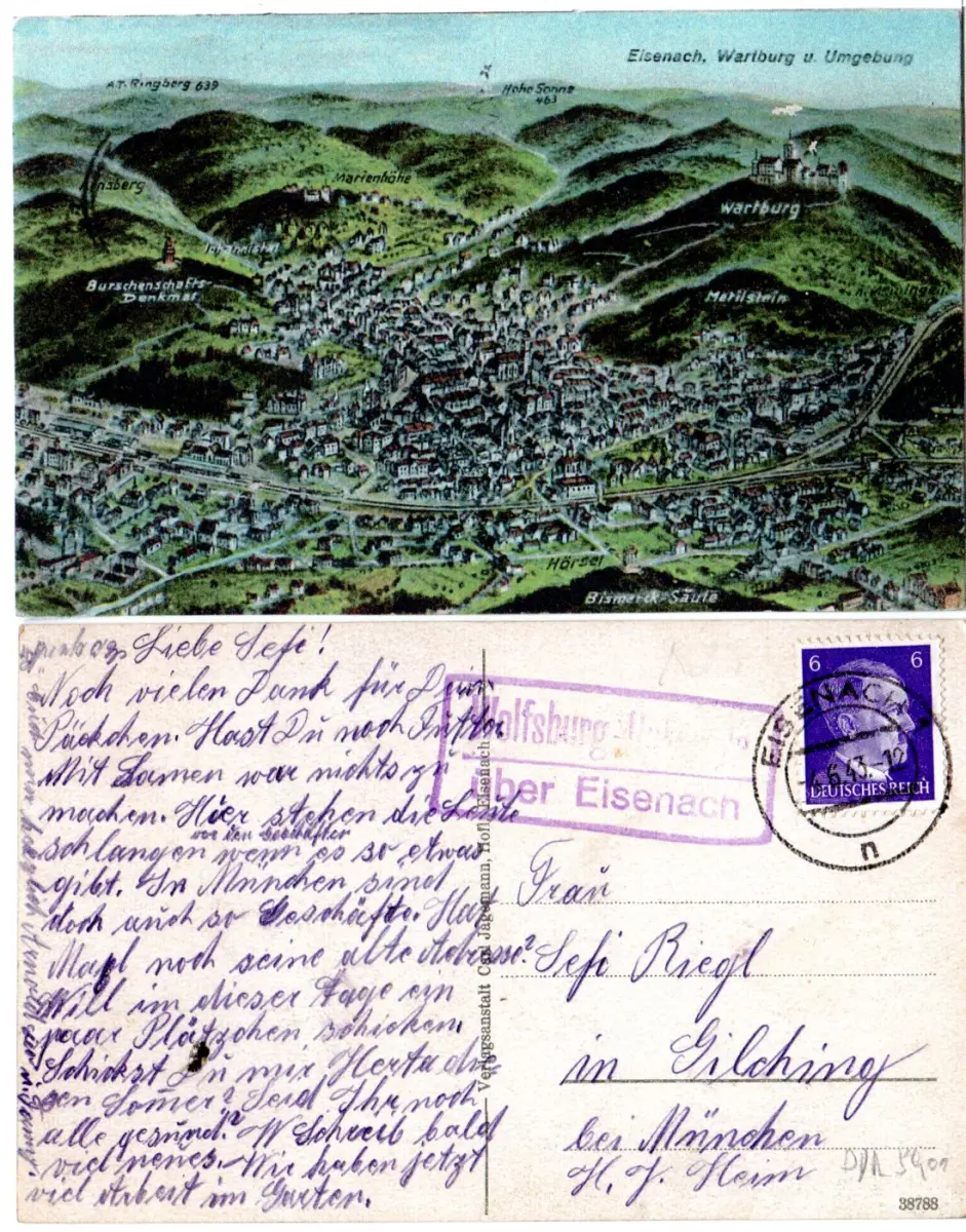 DR 1943, Landpost Stpl. Wolfsburg-Unkeroda auf Eisenach Farb-AK m. 6 Pf.