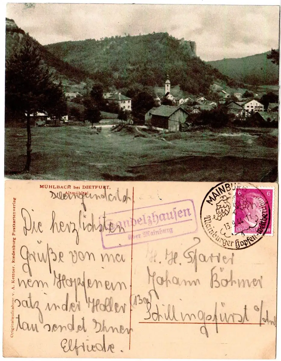 DR 1944, Landpoststpl. SANDELZHAUSEN über Mainburg auf Mühlbach sw-AK m. 6 Pf.