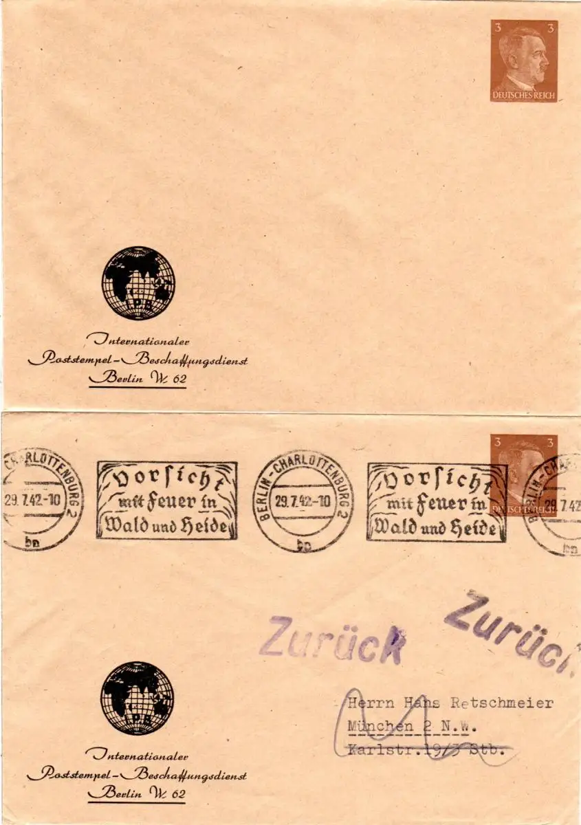 2 gebr. (Stpl. Berlin) / ungebr. Privatganzsachenumschläge (Strahlendorff/Mette Kat. PU 147-B1-01) Intern. Poststempel-Beschaffungsdienst m. Abb. Weltkugel.