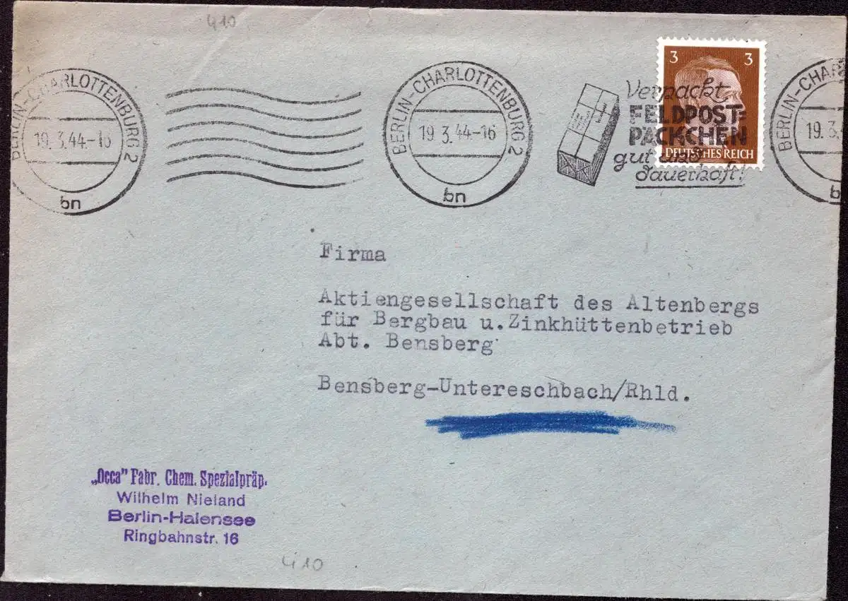 Freie Bezeichnung: DR Brief BERLIN-CHARLOTTENBURG - Bensberg Untereschbach - 19.3.44 - "Verpackt Feldpost-Päckchen gut und dauerhaft"