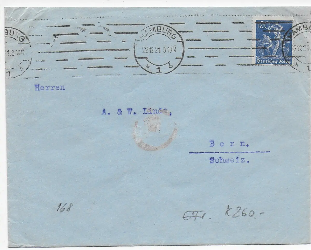 DR: Brief aus Hamburg 1921 nach Bern/Schweiz, EF MiNr. 168