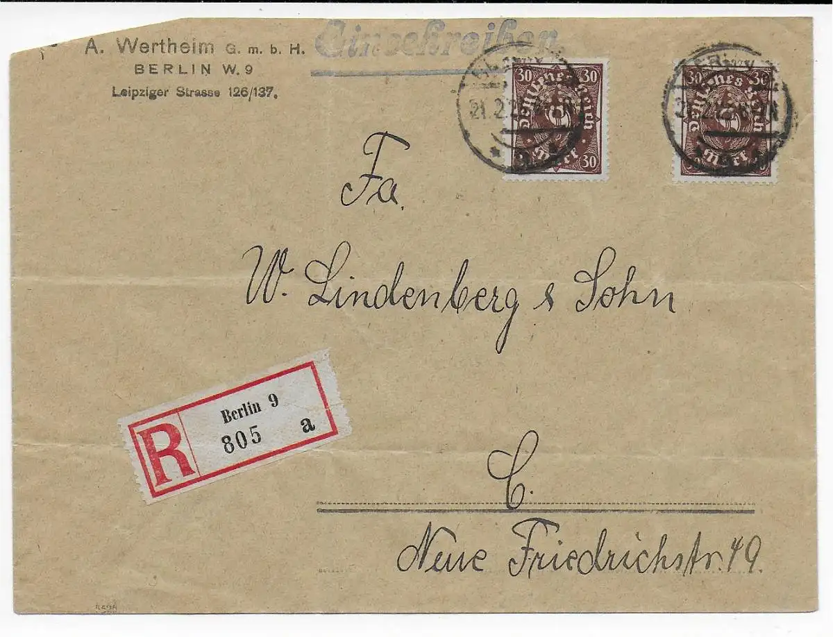 DR: Einschreiben Berlin, MeF, Perfin - Firmenlochung 1923