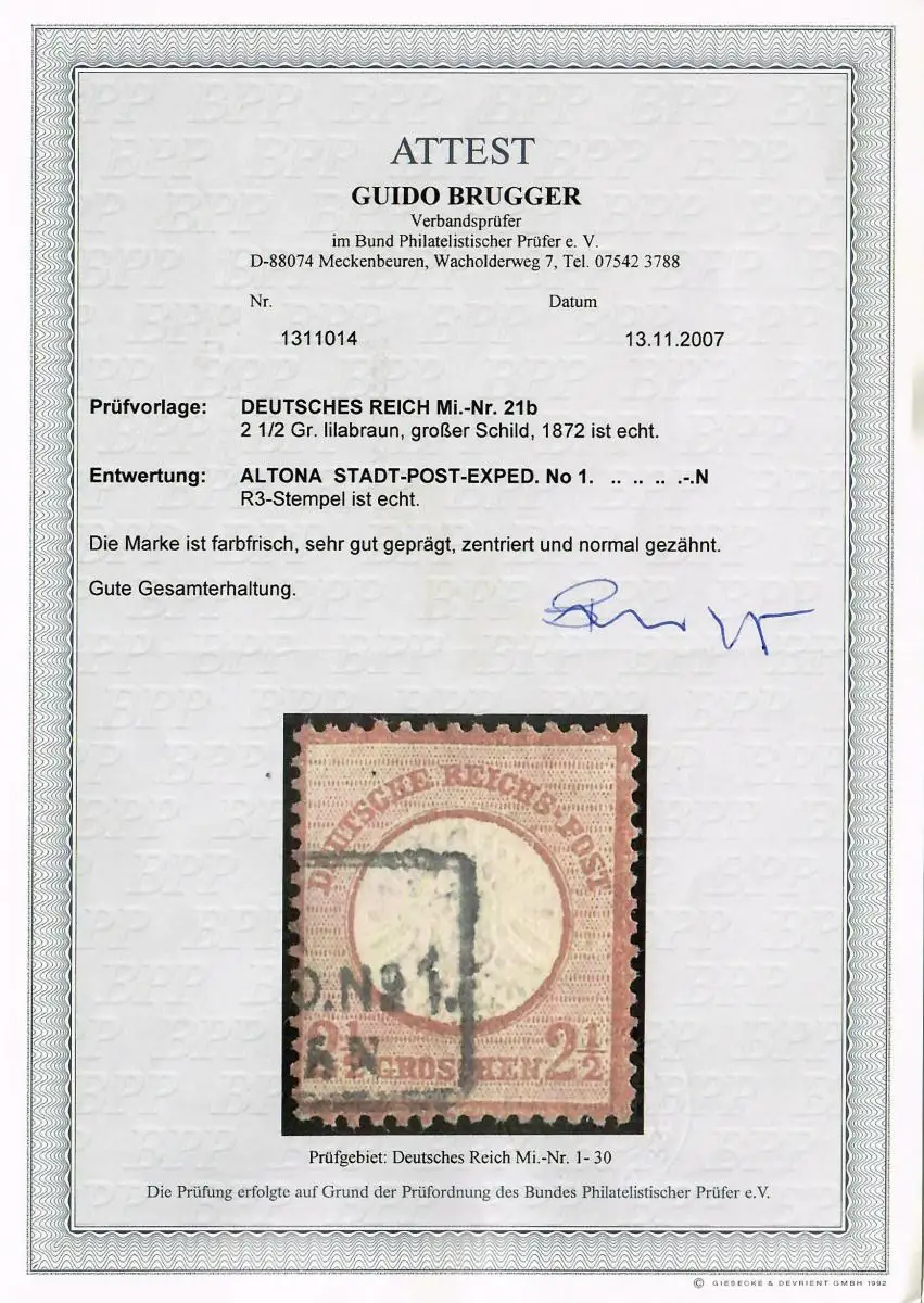 DR: MiNr. 21b, gestempelt Altona, Stadt-Post Exped, BPP Attest