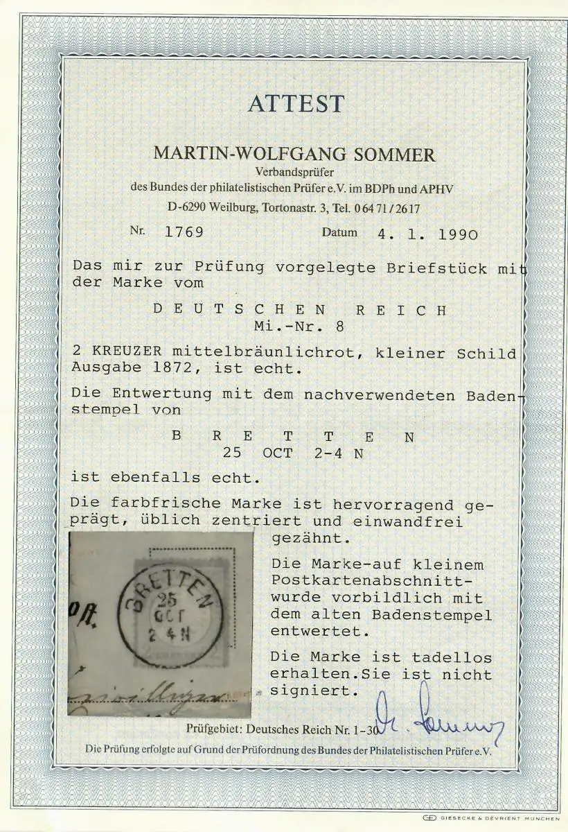 DR: MiNr. 8, gestempelt Bretten, auf Briefstück, BPP Attest