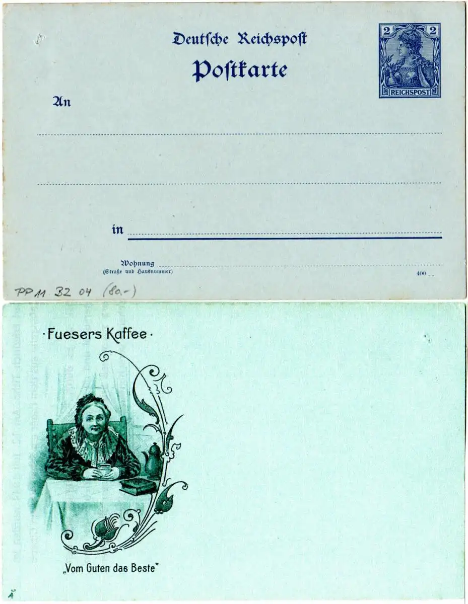 5 Pf. Germania Reichspost Privatganzsache Fuesers Kaffee "Vom Guten das Beste" m. rücks. Abb. Frau in Tracht am Tisch m. Kaffeekanne u- -tasse.