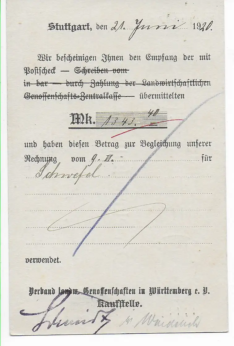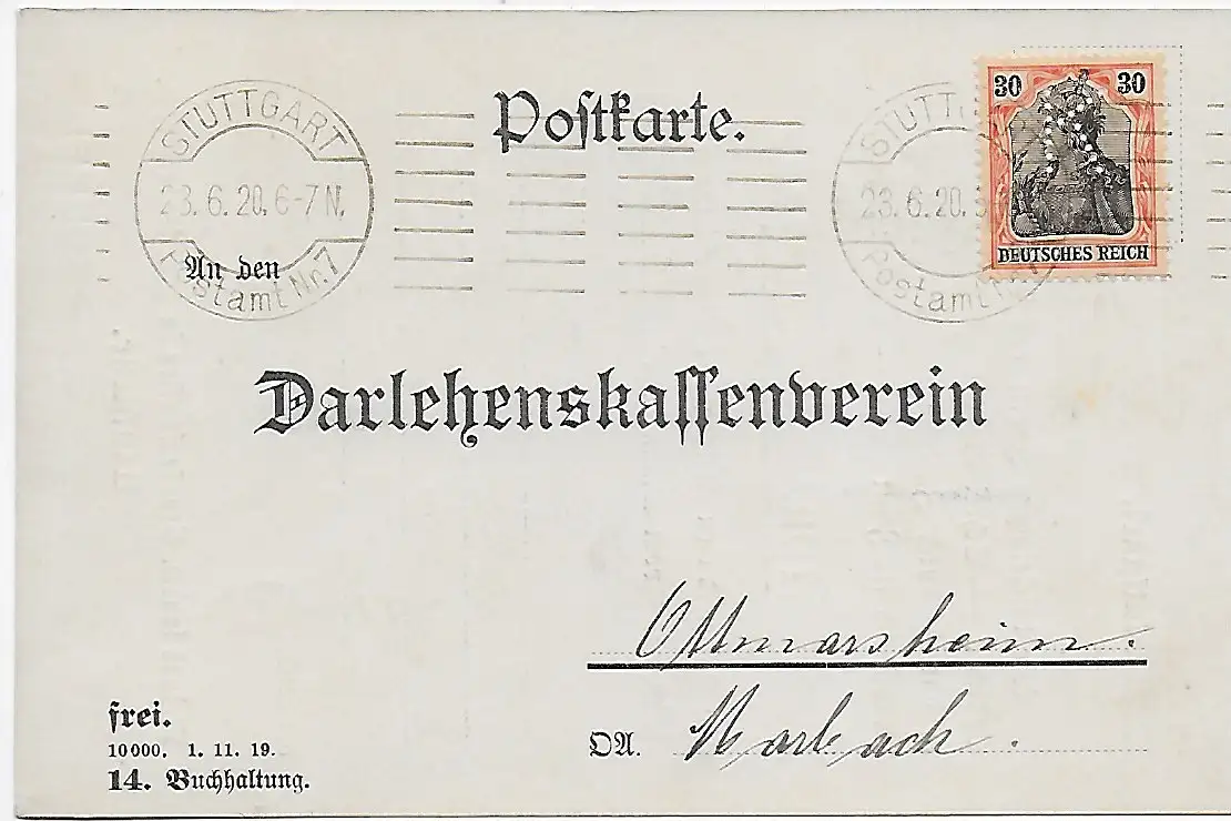 DR: Postkarte von Stuttgart 1920 nach Ottmarsheim, Perfin-Firmenlochung -k-