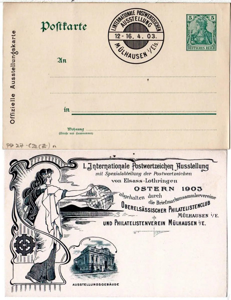Privatganzsache zur Privatganzsache 1. Internationalen Postwertzeichen Ausstellung Mühlhausen (m. Spezialabteilung der PWZ v. Elsass-Lothringen) Ostern 1903. Mit Jugendstil-Abb. Frau m. Weltkugel u. Briefmarkenalbum sowie des Ausstellungsgebäudes.