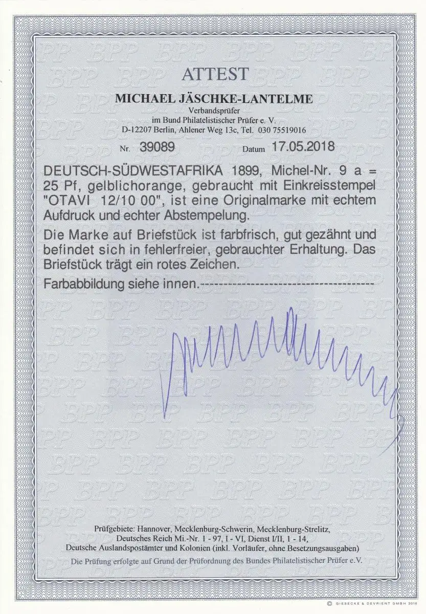 DSWA: MiNr. 9a, gestempelt auf Briefstück Otavi, BPP Attest