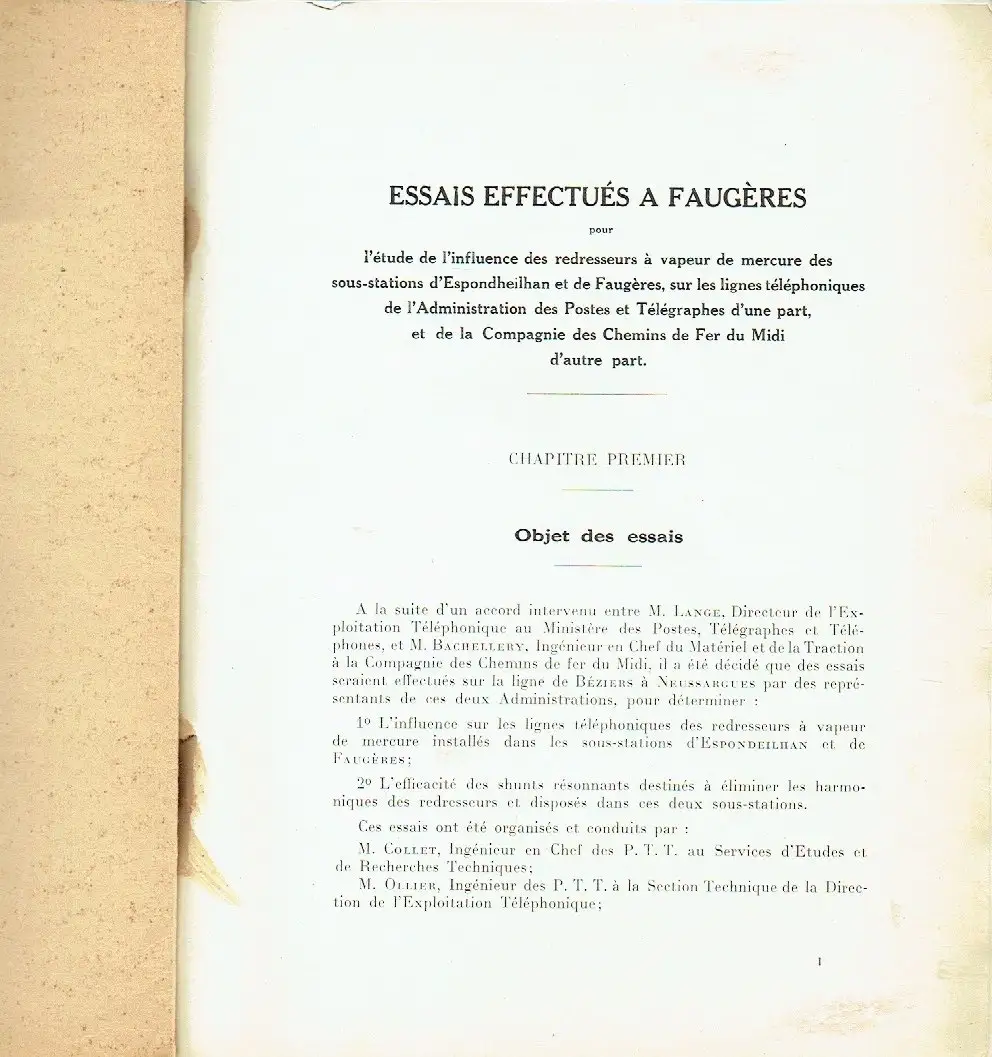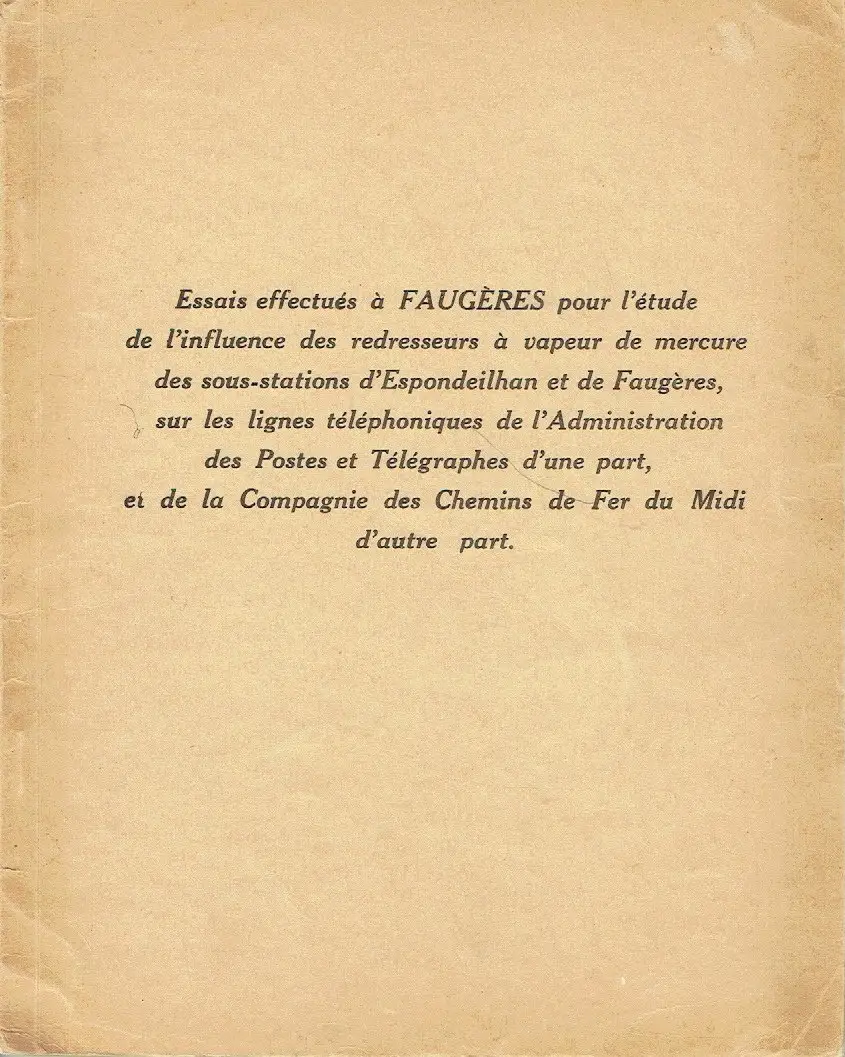 Dachary Gilles Ollier Collet: ESSAIS EFFECTUÉS A FAUGÈRES pourl'étude de l'influence des redresseurs à vapeur de mercure dessous-stations d'Espondheilhan et de Faugères, sur les lignes téléphoniquesde l'Administration des Postes et Télégraphes d'une par