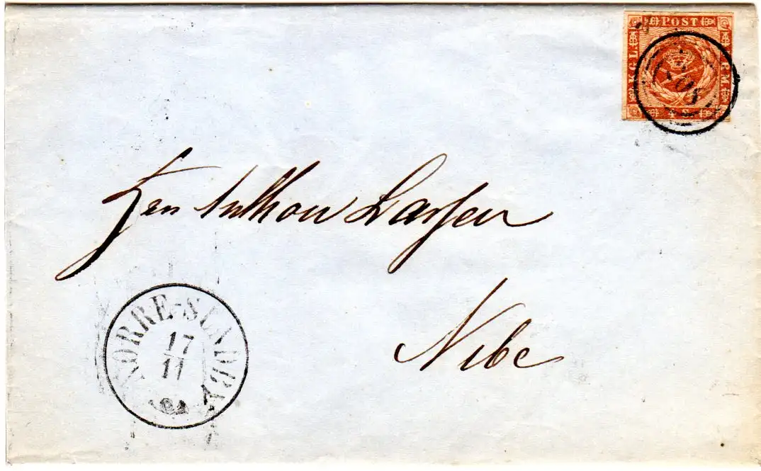Schöner Brief n. Nibe m. kpl. Inhalt u. breitrandiger, rechts kurz berührter 4 Sk.