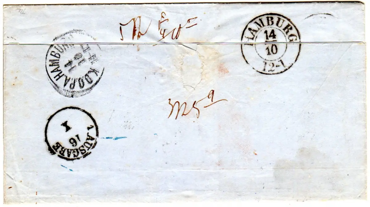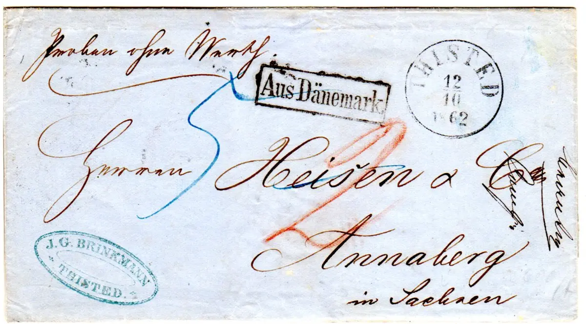 Faltbrief m. Inhalt v. Thisted via Hamburg nach Annaberg in Sachsen. Weitere Stempel rückseitig. Gesamtporto "5" NGr.