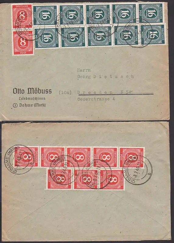 Dahme (Mark) 7.7.48 10fach-Frankatur mit Ziffen-Marken