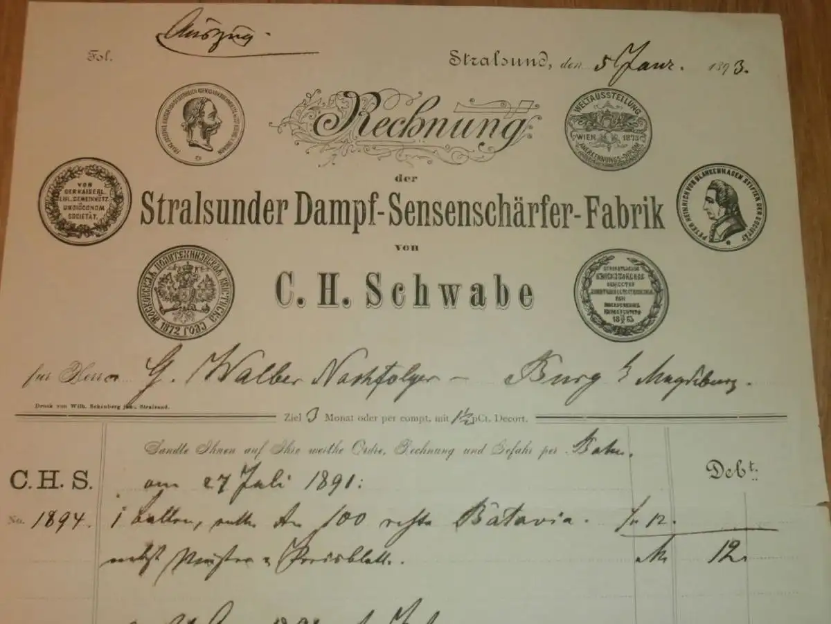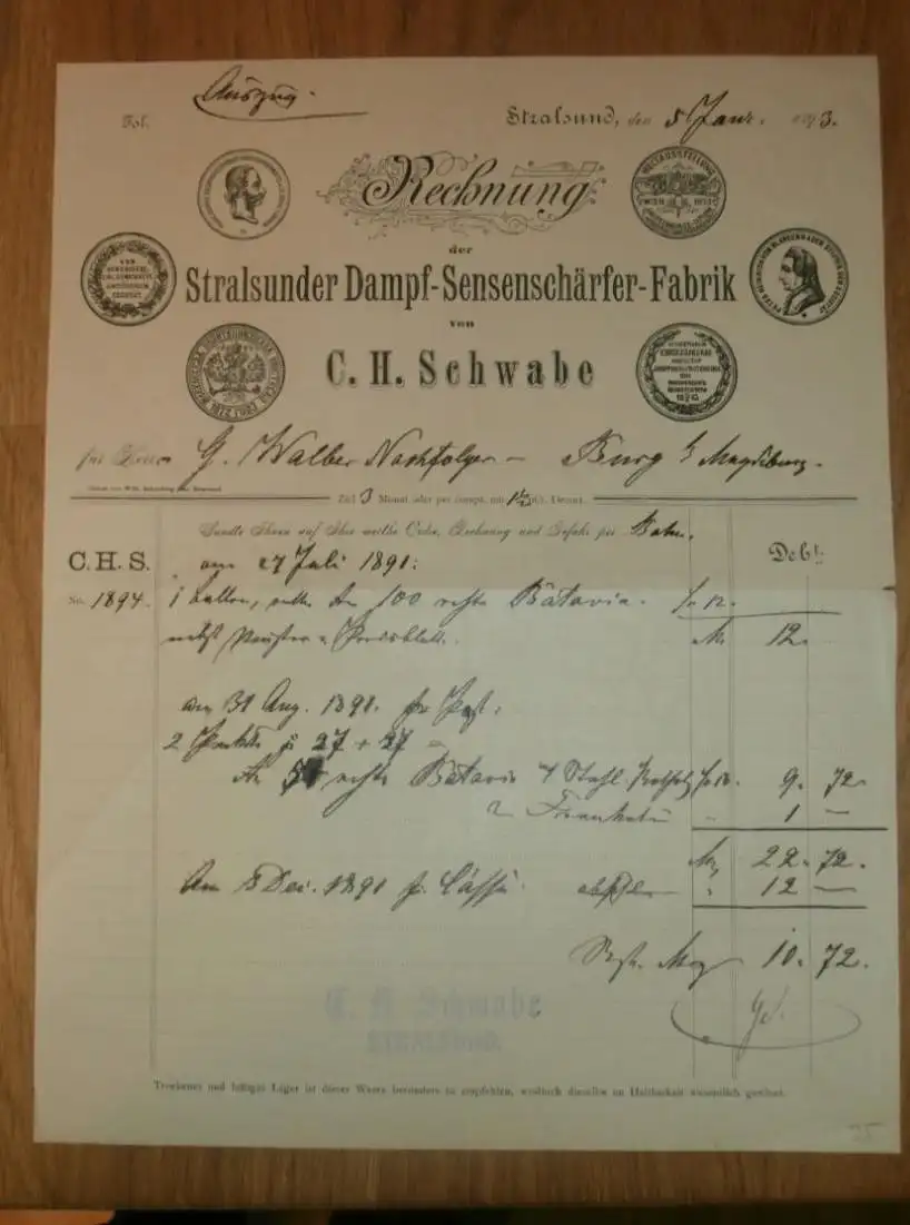 Dampf-Sensenschärfer-Fabrik in Stralsund , 1893 , C.H. Schwabe , alte Rechnung , Mecklenburg !!