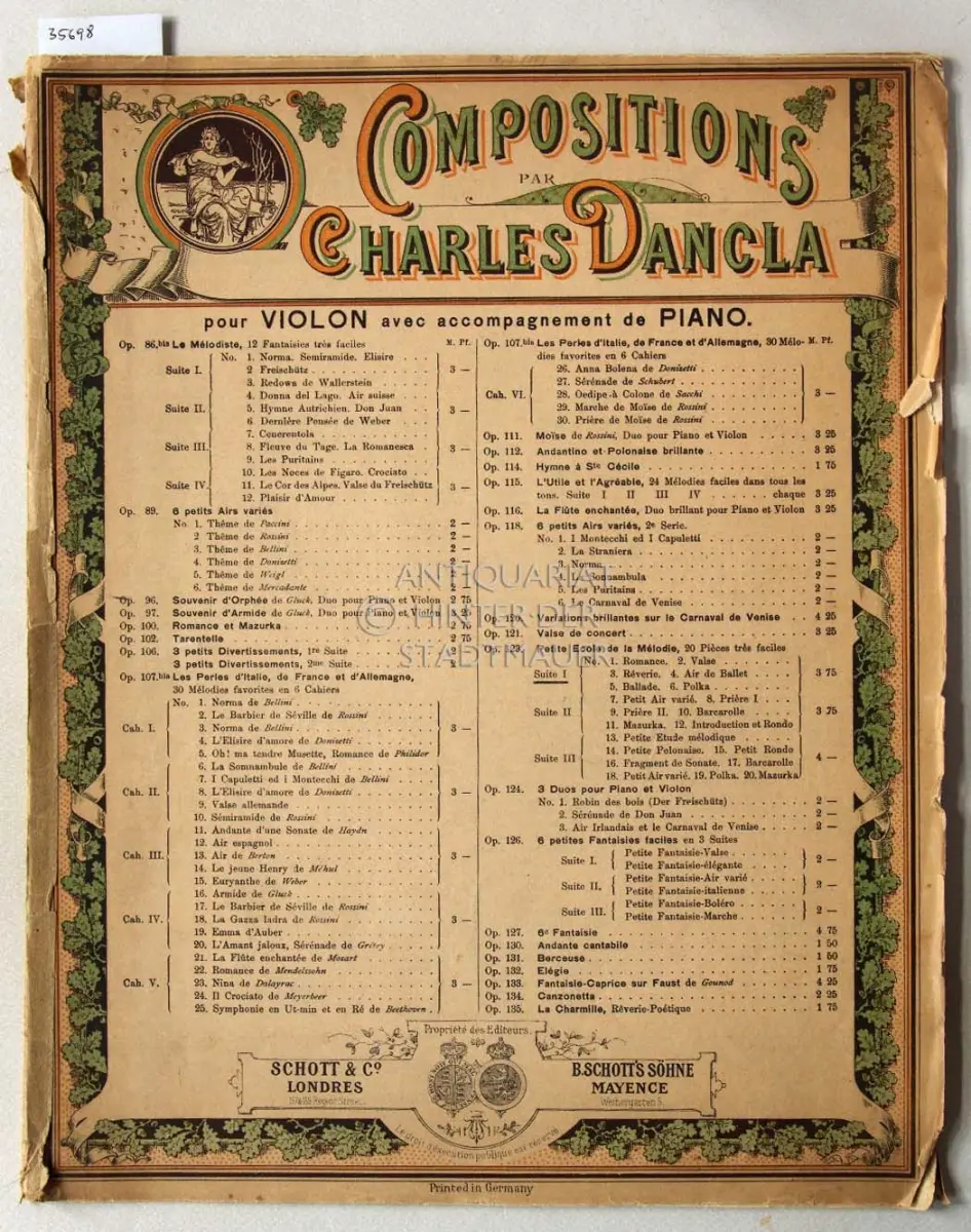 Heft, geklammert, dies die Klavierpartitur; innenliegend separate Violinstimme. Rücken und Seitenränder des Umschlags stärker rissig, Ecke unten durchs Heft fingerfleckig, Notentext ohne Eintragungen; noch gutes Exemplar