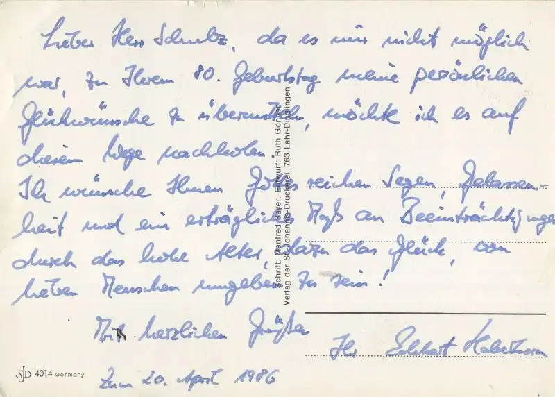 Ich hatte die Rechnung sofort als Vorkasse bezahlt, aber keine Zusendung der Karte erhalten. Trotz Nachfrage keine Rückmeldung bzw. Erklärung. Da es sich zum Glück nur um 1,70 € handelt, ist die Sache für mich erledigt, ärgerlich, aber zu verkraften. Mit den drei anderen Karten, die ich bestellt hatte, hat alles wunderbar geklappt.