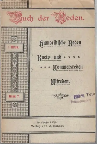 Danner, G: Buch der Reden. Eine reichhaltige Sammlung ernster und heiterer Reden, Ansprachen und Toaste in Poesie und Prosa. ( = Danner ' s Buch der Reden Band 7: Humoristische Reden, Kneip- und Kommersreden, Ulkreden ).