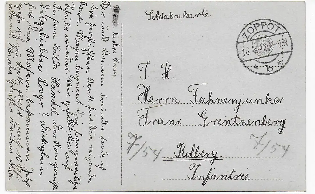 Danzig: Feldpost I. WK, Zoppot 1912 nach Kolberg, Infantrie