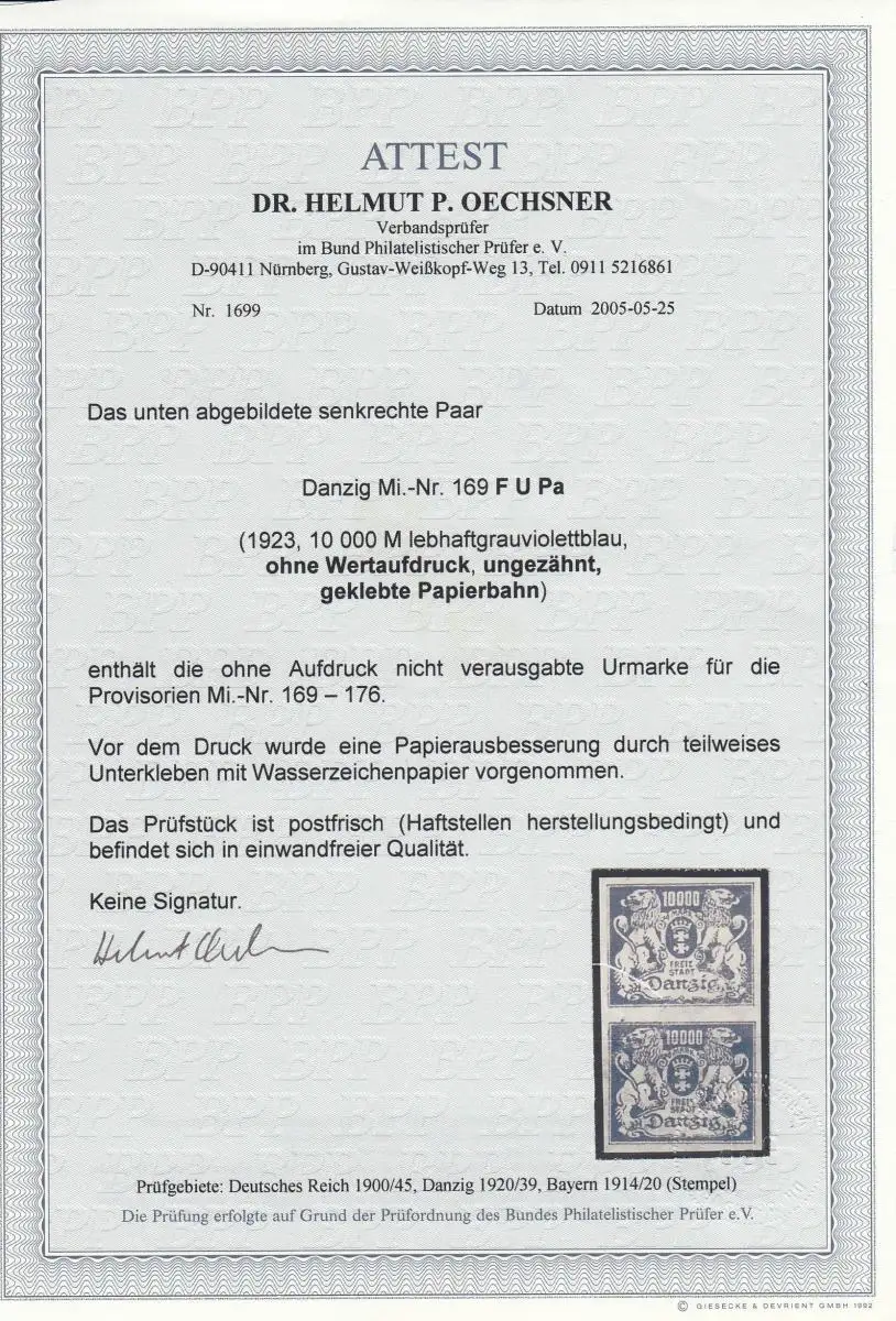 Danzig: MiNr. 169 F U Pa, gekebte Papierbahn, ohne Wert, ungez. BPP Attest, **