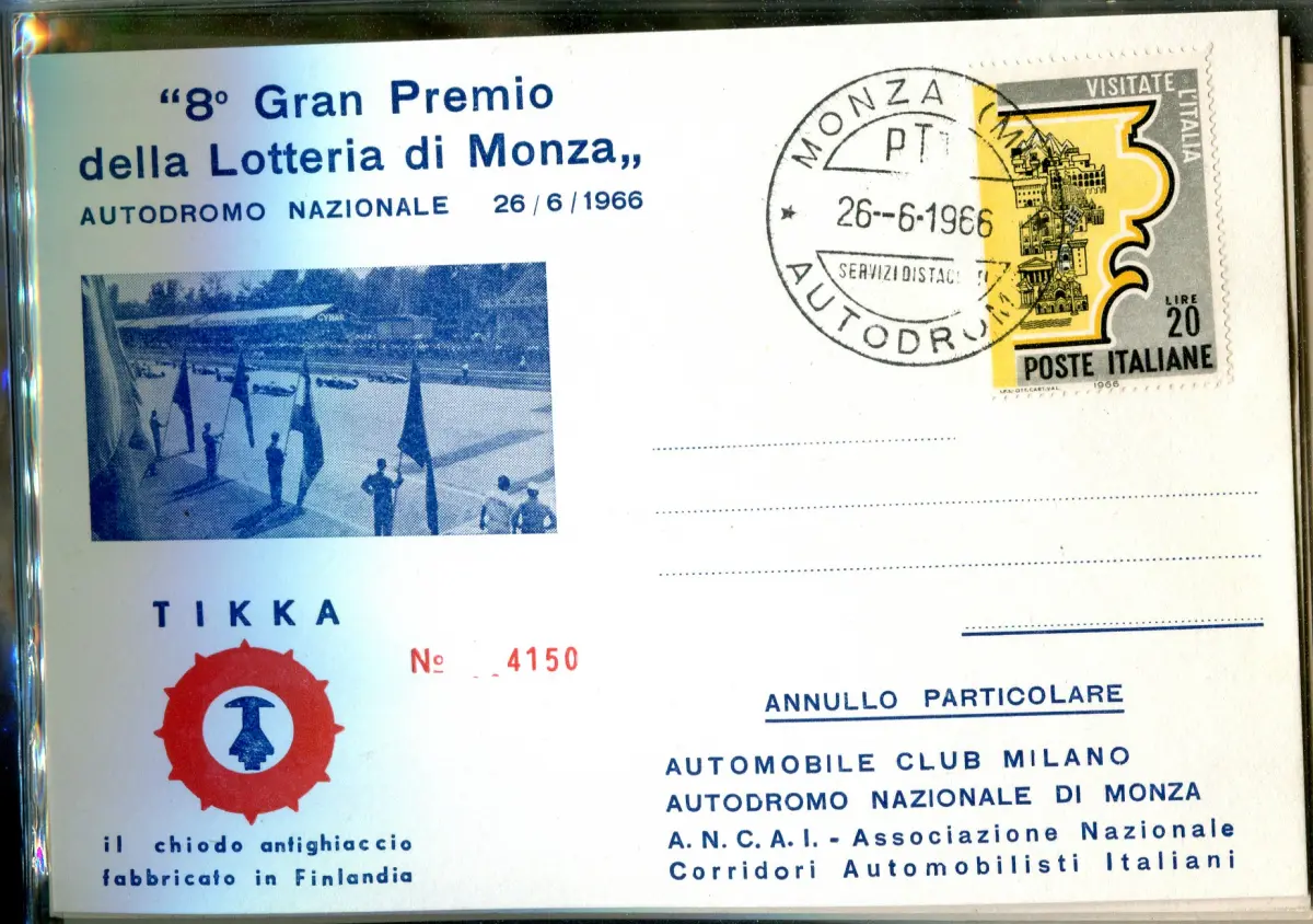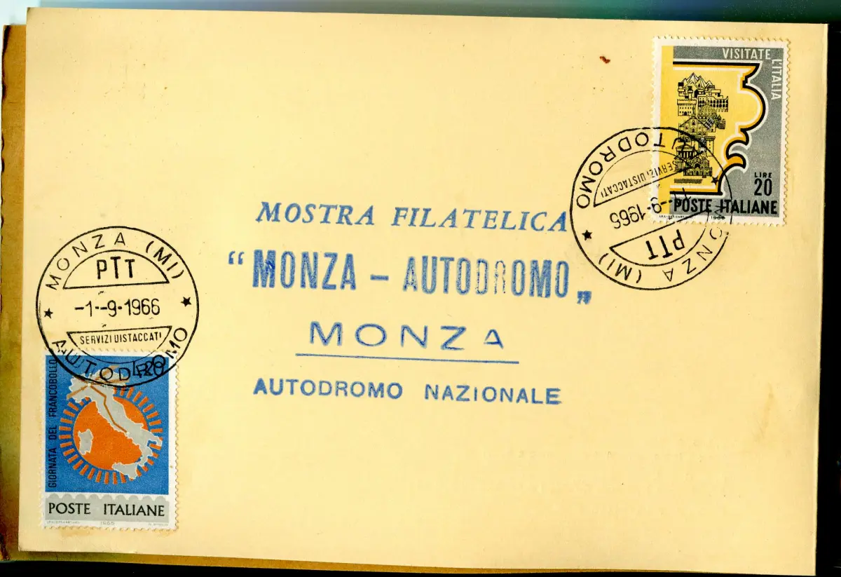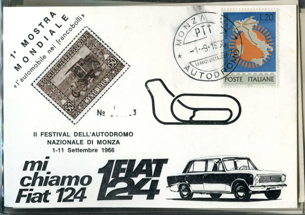 Das Auto in den Briefmarken - Autodromo di Monza 1966 Libretto in limitierter Auflage des Philatelistischen Kreises Monzese für die Philatelieausstellung auf der Rennstrecke 1966 - Enthält 3 Postkarten der Trophäe F. Caraccciolo mit den Annullierungen vom 23.25.4.1966 + Postkarte vom 8. Großer Preis der Lotterie Monza + 11 Postkarten der 1^ Weltausstellung des Automobils in Briefmarken mit Annullierungen vom 1.11.9.1966 - Selten zusammen Cod. 382/WEB