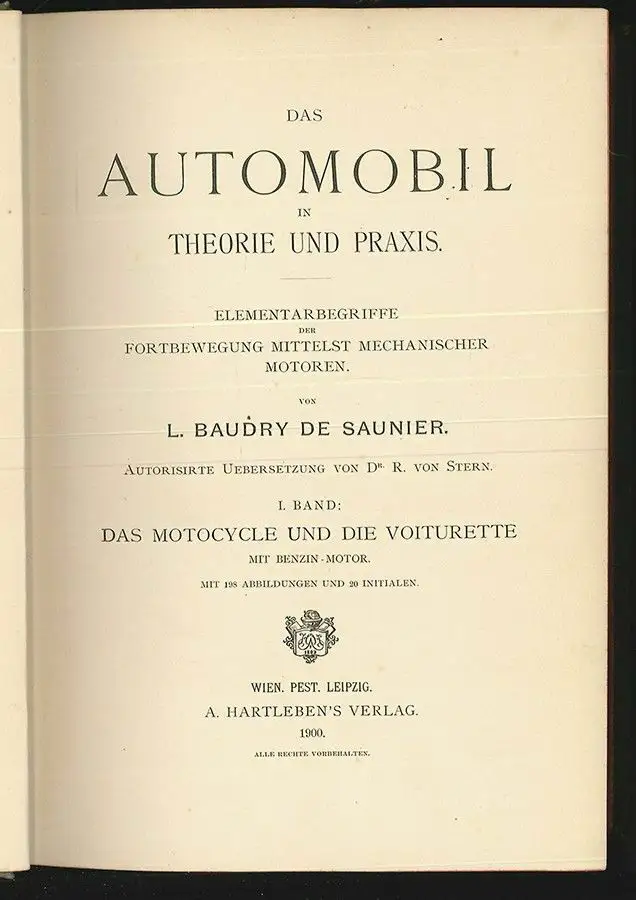 Bemerkungen: Fromm 23614 - I. Bd.: Das Motocycle und die Voiturette mit Bezin-Motor. II. Bd.: Autmobilwagen mit Benzin-Motoren.