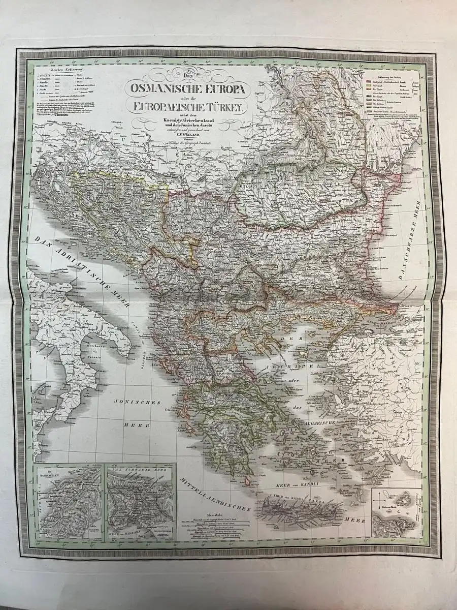 Bemerkungen: Espenhorst 1.1.2 bzw. S.20-23 - Altkolorierte Karte von Südosteuropa mit 3 kl. Nebenkarte der Dardanellen, des Gebietes um Istanbul und Korfu. Aus dem letzten, 60 Karten umfassenden "Allgemeinen Hand-Atlas der ganzen Erde nebst den besten astronomischen Bestimmungen, neuesten Entdeckungen und kritischen Untersuchungen entworfen" der unter Carl Ferdinand Weiland (1782-1847) im Verlag des geographischen Institutes in Weimar erschienen ist. Die Karten sind teils in der Platte (Kartusche) mit Jahreszahlen 1829 bis 1833 datiert.