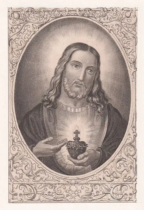 Bemerkungen: In einem von reichem Blattwerk gerahmten Medaillon ist Christus als Brustfigur dargestellt. In seiner linken Hand hält er das flammende Herz mit Kreuz und Dornenranken.