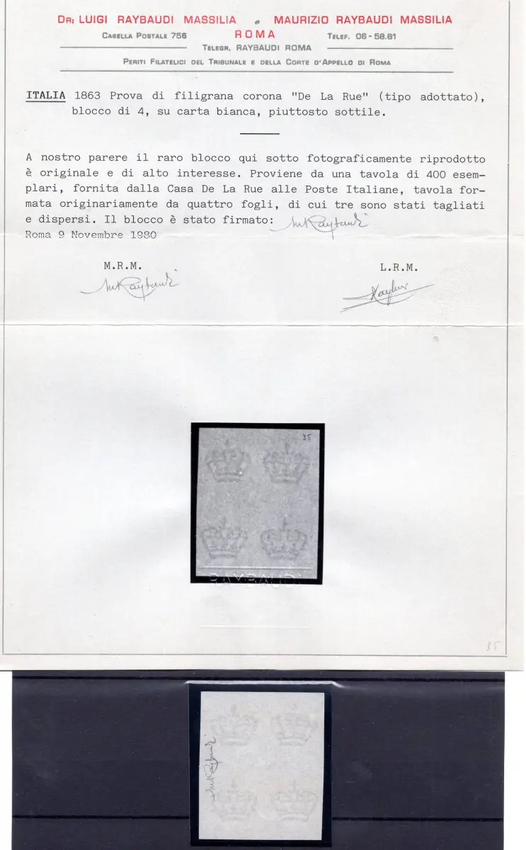 OHNE GUMMI - De la Rue - Proof filigrane Krone (Typ angenommen) Viererblock ungezähnt auf eher dünnem weißem Papier - Selten - Zert. Ray. Massilia Cod.319/182