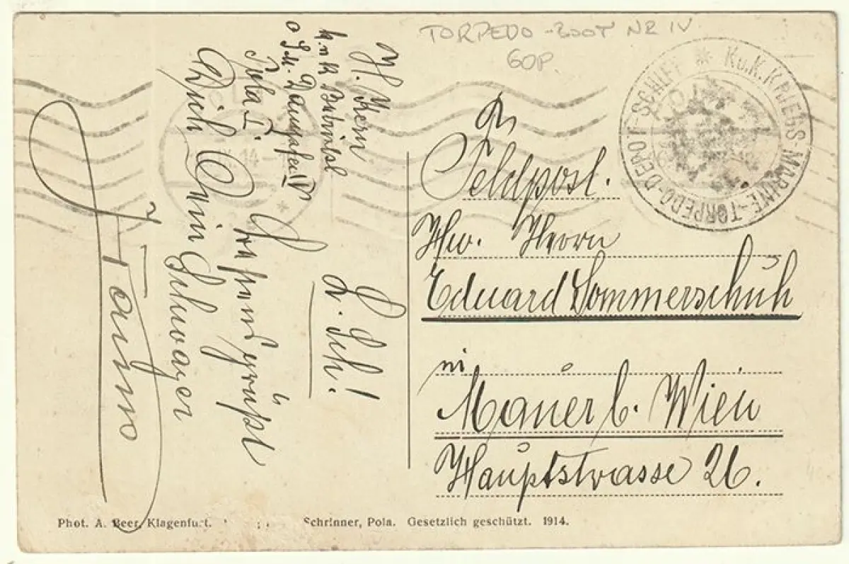 Bemerkungen: Gelaufen m. Stempel: Mietdampfer Österr. Lloyd - 1914-1917. Torpedodepotschiff - 2. Torpedoflottille. K.u.K. Kriegs-Marine / Adler / Torpedodepot-Schiff. Zweikreisst. schwarz / KALIS 1-P.60 - neben Tst. Pola / 16. IX. 14.