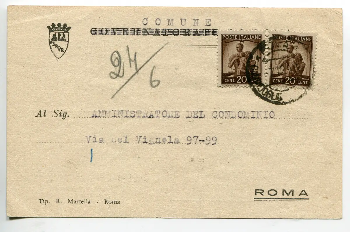 Democratica Cent. 20 zwei Exemplare auf Postkarte - Democratica Cent. 20 Nr. 544 zwei Exemplare auf Postkarte (Drucke) aus Rom pro Stadt am 7.12.45 - Seltene Nr. 472/5