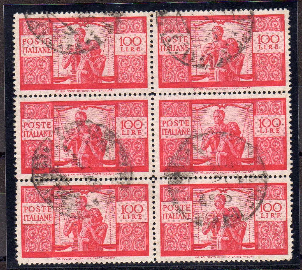 Gebraucht - Democratica Lire 100 Nr. 565 Verzahnung 14 x 13,1/4 (II. Platte) Block von sechs Exemplaren in ausgezeichneter Qualität und Zentrierung Cod. 271/15
