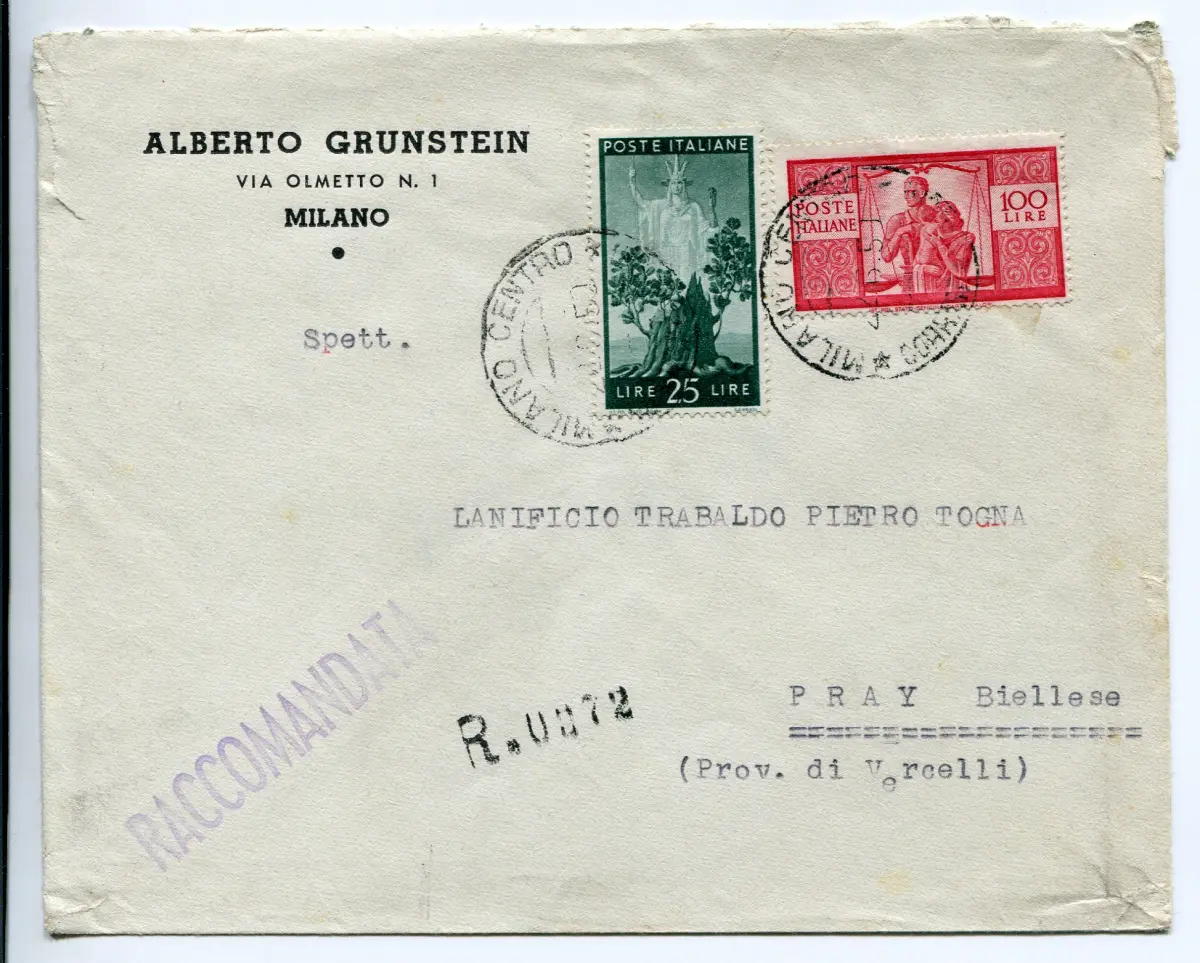 Democratica Lire 100 + Ergänzung auf Umschlag Racc. a Vercelli - Democratica Lire 100 Nr. 565 (I Platte) + Ergänzung Nr. 562 auf Umschlag Racc. von Mailand nach Vercelli am 22.6.50 - im Tarif, vier Häfen Code 372/11