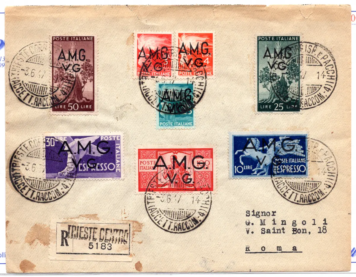 - AMG. Sehr guter Zustand. - Democratica Lire 100 Nr. 21 + Ergänzungen Nr. 13 + 15 + 16 + 19 + 20 + Exp. 1/2 auf Umschlag Racc. exp. Von Triest nach Rom am 3.6.47 - philatelistischer Gebrauch, aber gereist mit Annullierung der Ankunft und Expresszustellung Nr. 835/L