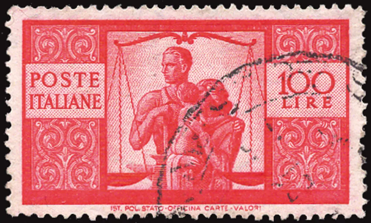 GEBRAUCHT - Democratica Lire 100 Nr. 565 lebendiges Karmin, zweite Verzahnungsplatte 14 x 13,1/4 weißes Papier sehr gut zentriert Position. 50 (Sass. spec. n. 24Ab) - Selten in diesem Zustand - Kat. euro 500 Cod.551/182