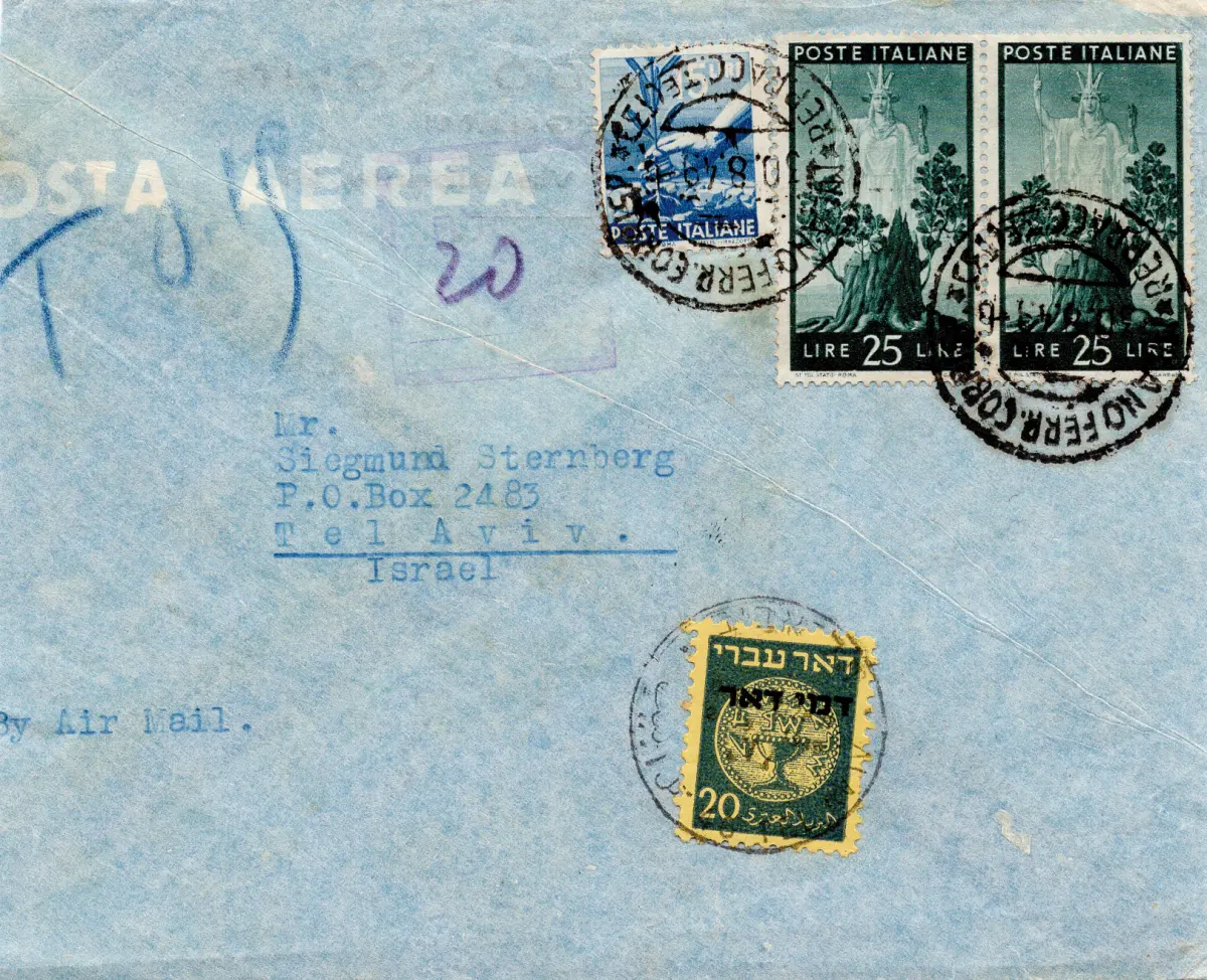 Umschlag - Demokratische Lire 25 Nr. 562 Paar + Ergänzung Nr. 560 auf Luftumschlag nach Tel Aviv, der bei der Ankunft für 20 Prutah besteuert wird. - Bestimmungsort und Besteuerung, einseitig beschnittener Umschlag Cod. 247/17